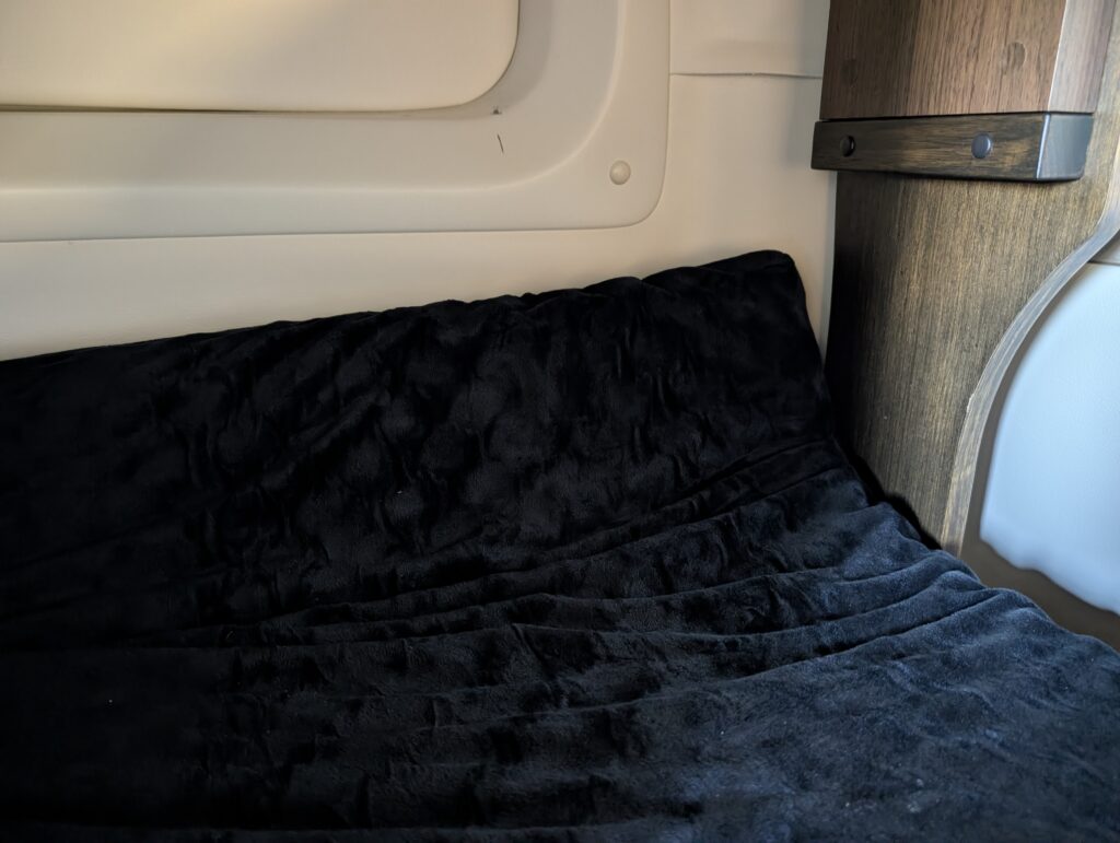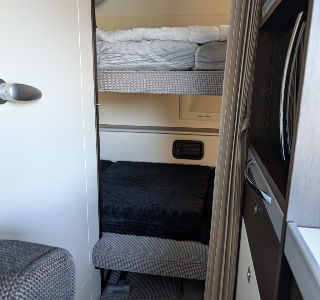 本当はダイネットも10cm厚を敷きたい所でしたが、畳んだサイズが大きすぎて後ろ(常設2段ベッド)に積めないため断念しました。このマットレスなら、クルッと丸めて簡単に後ろに積めます。