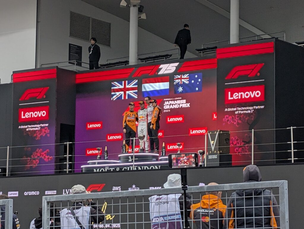グランドスタンド寄りの席はV1前のビジョンも見えますが、正直どちらのビジョンも遠く、しかも横から見る形になって見えにくいです。