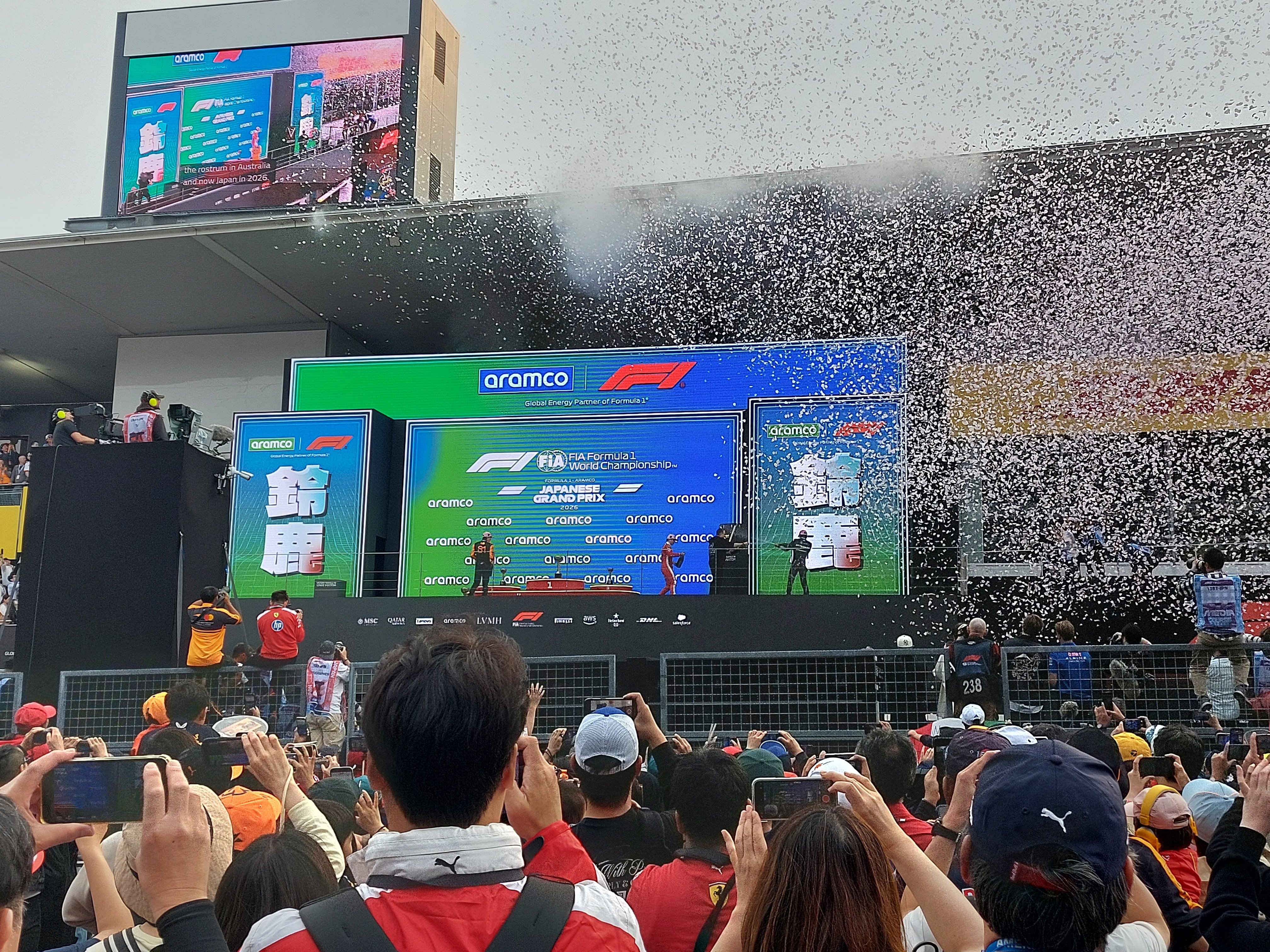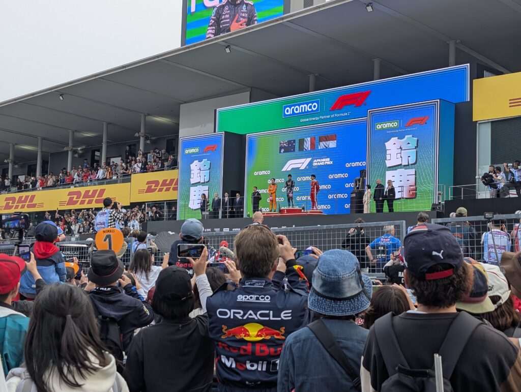 S席の特典のひとつとして、表彰式をコース上で観られるというのがあります。S席の子連れの人のみなので、コース上にはかなりのゆとりがあり、なんならピットから離れた方が金網にもかからず見やすいくらいです。