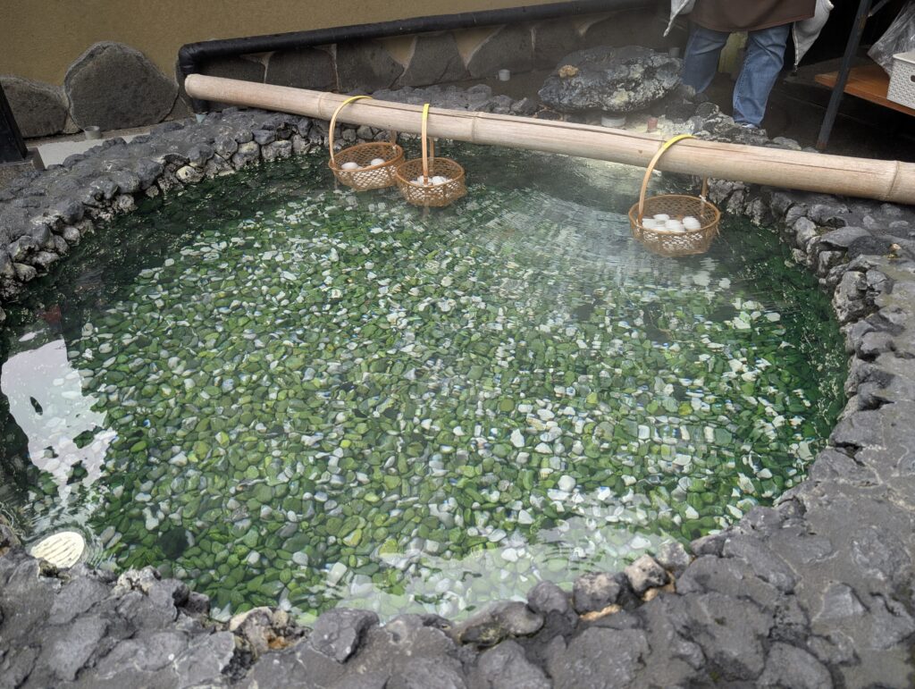 その「おさ湯」から少し先に行ったところに、まさに温泉で茹でている温泉卵を食べられるお店があります!