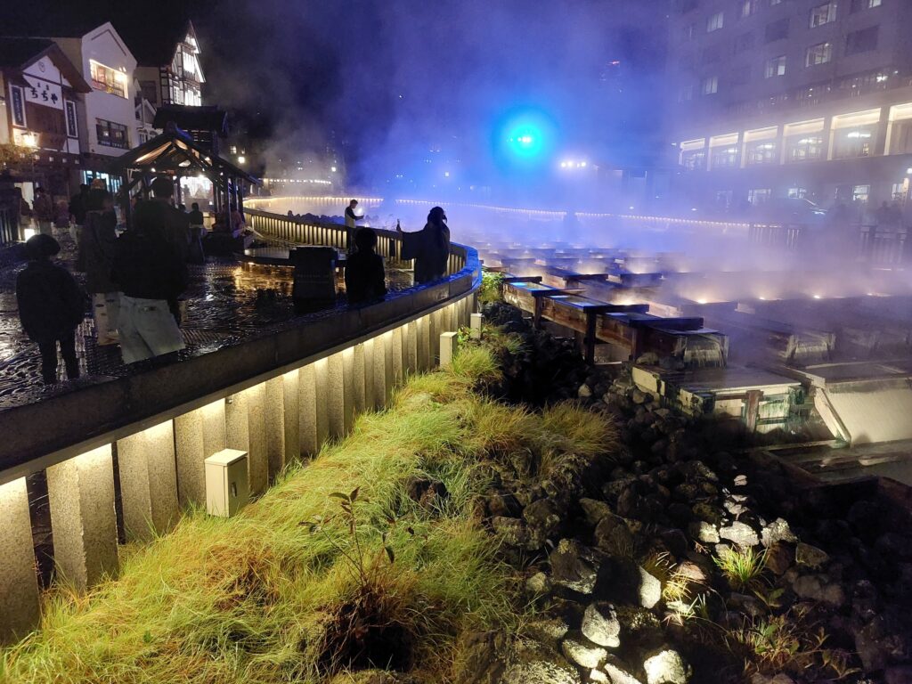 夜になるとライトアップされた湯畑が幻想的に輝き、湯けむりの中に浮かび上がる景色はまるで別世界。