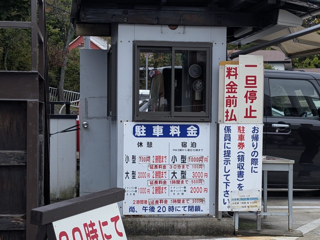周辺のホテルや旅館に泊まるよりもはるかに安く、車中泊なら午後3時~翌朝10時まで1泊1000円〜3000円台で利用できます。(2025.10.現在)